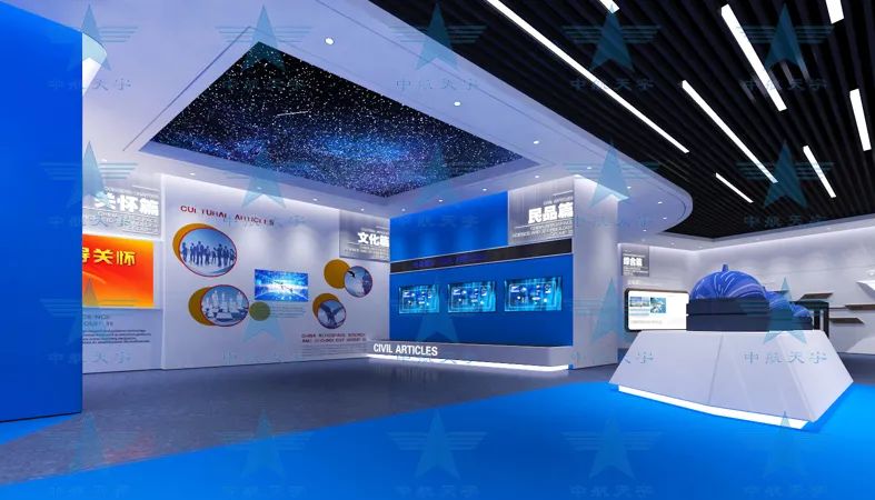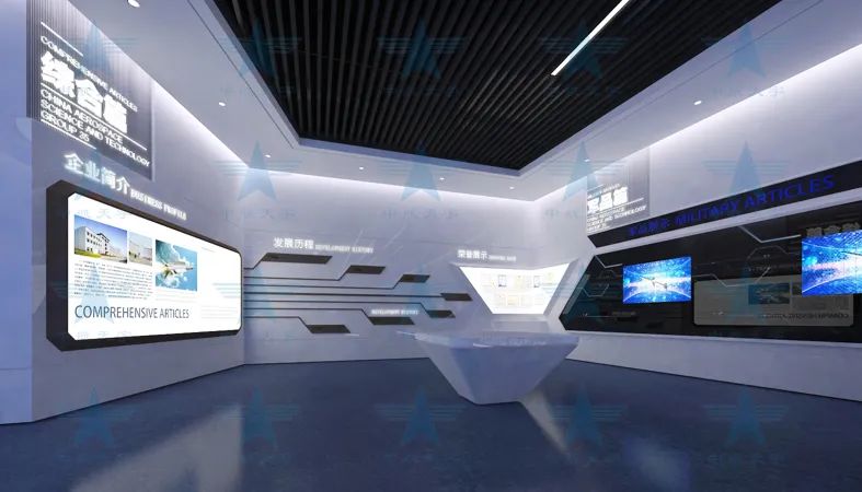 灯光的设计 同样是保证展陈效果的体现,灯位的穿插变化简洁而错落有致,纵向排布的条灯与黑色栅格吊顶相互结合,使空间贴切产品特性,具有纵深感、科技氛围,灯光的设计同时使 360°全息柜 具有更完美的展示条件,从而保证了“幻影成像”的展示效果。